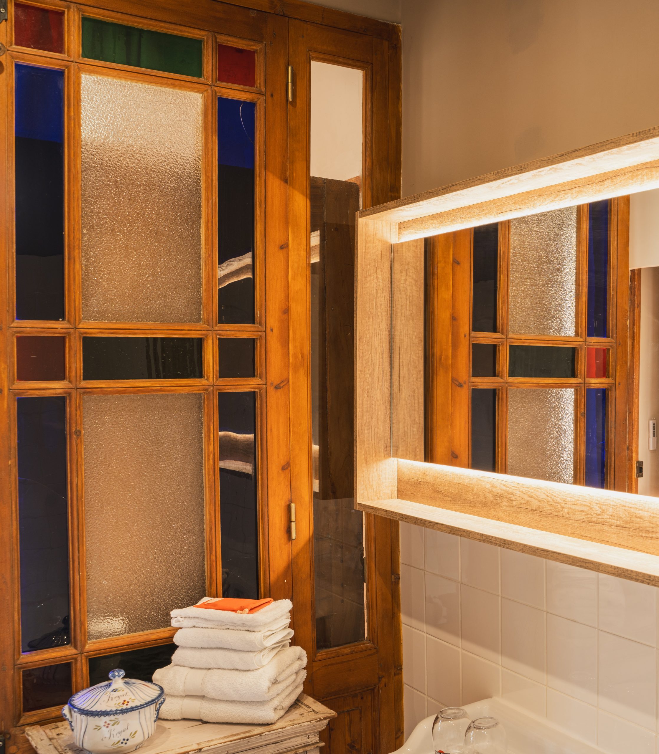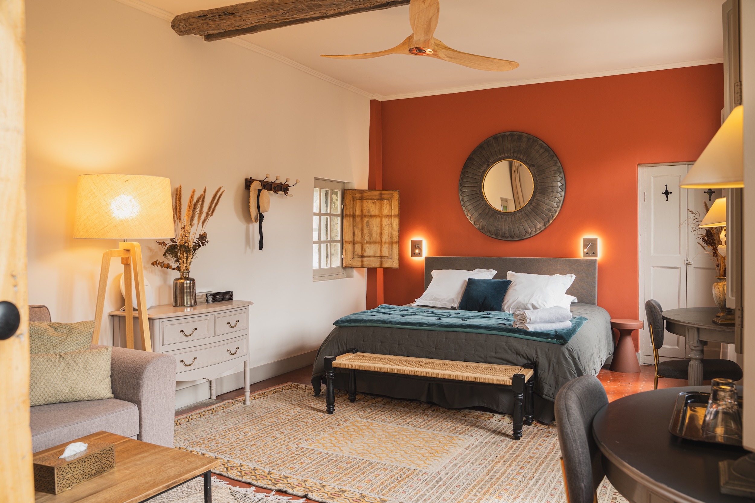 Une suite chaleureuse et spacieuse, climatisée, face au jardin avec sa large salle de bains privative et un couloir séparé. La suite peut accueillir 2 à 3 personnes.