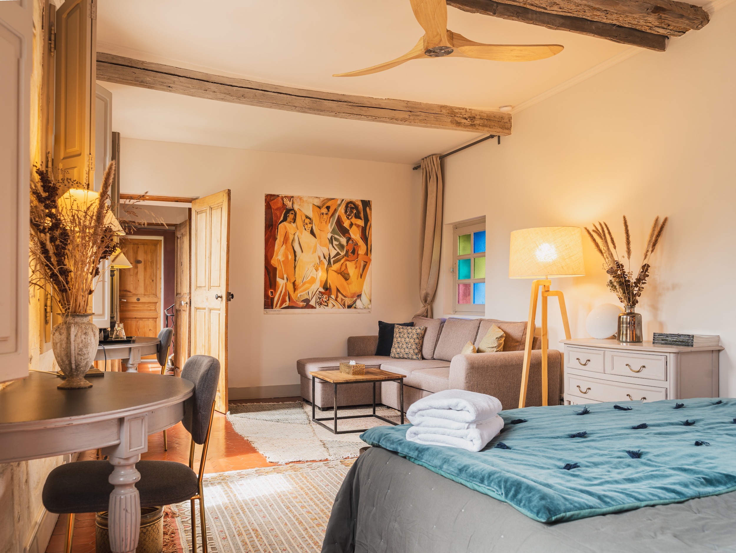 Notre plus grande suite généreuse et confortable avec salle de bains privative.